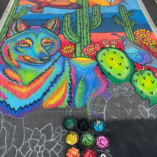 This year, I chalked “Colorful Coyote,” a 9-by-12-foot piece celebrating the beauty of the Southwestern desert. Growing up in both Tucson, Arizona, and Reno, Nevada, I wanted to showcase some of my favorite desert dwellers in a wide array of breathtaking colors. It was an absolute blast chalking up this design!
